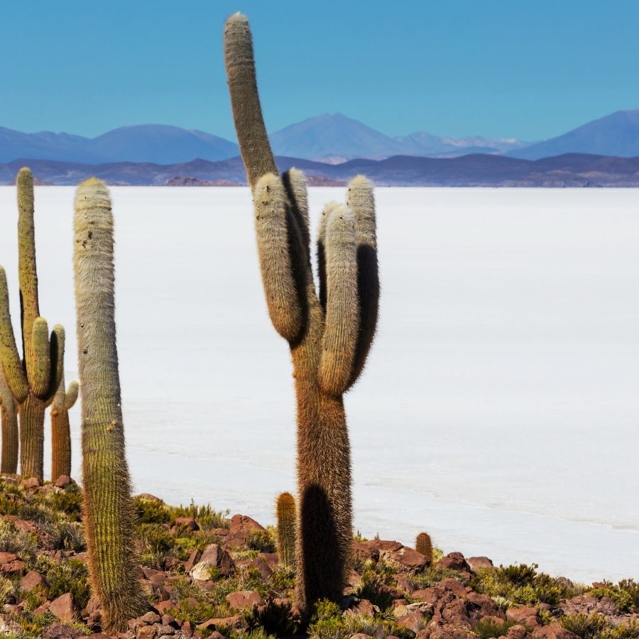Sergio, le petit lama, se trouve sur un des sites incontournables de Bolivie, le plus grand désert de sel au monde, le Salar d'Uyuni. Sa blancheur étincelante et sa platitude parfaite créent des paysages impressionnants agrémenté de cactus géants (de 10 à 12 mètres de haut) qui se trouvent sur les quelques îlots au centre du Salar !